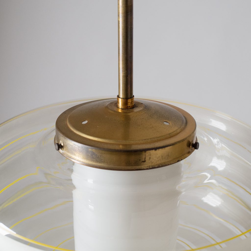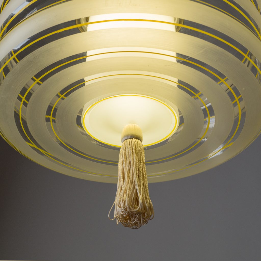 Description: Rare Art Deco lantern from the 1920-1930s. Blown glass diffuser with acid-etched stripes and yellow hand-painted lines. Inside the ribbed glass body is an opaline glass tube covering socket and bulb. Pale Ivory-colored tassel/finial. One original brass and ceramic E27 socket with new wiring. Height without stem is 12inches/30cm.